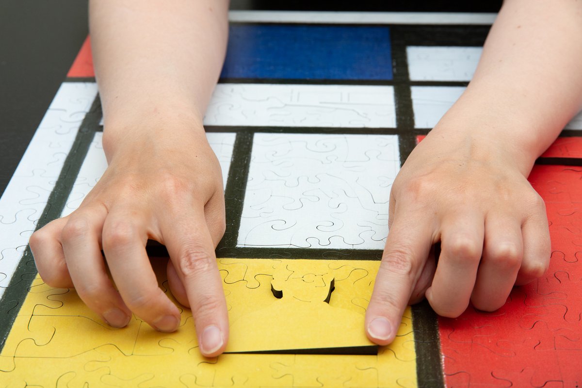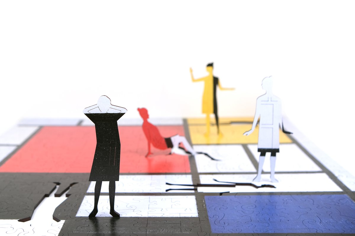 『大紅色的平面構成.黃色.黑色.灰色和藍色』是蒙德里安的代表作。其美學思想不只影響荷蘭藝術圈,也滲入歐洲各國繪畫、雕塑、建築、時尚等領域。像法國時尚大師聖羅蘭以此畫為靈感,設計知名的連身裙,在當時引起了時尚圈的轟動。因此特殊拼片以穿著蒙德里安連身裙的女子穿梭於拼圖中,宛如一場時裝秀。