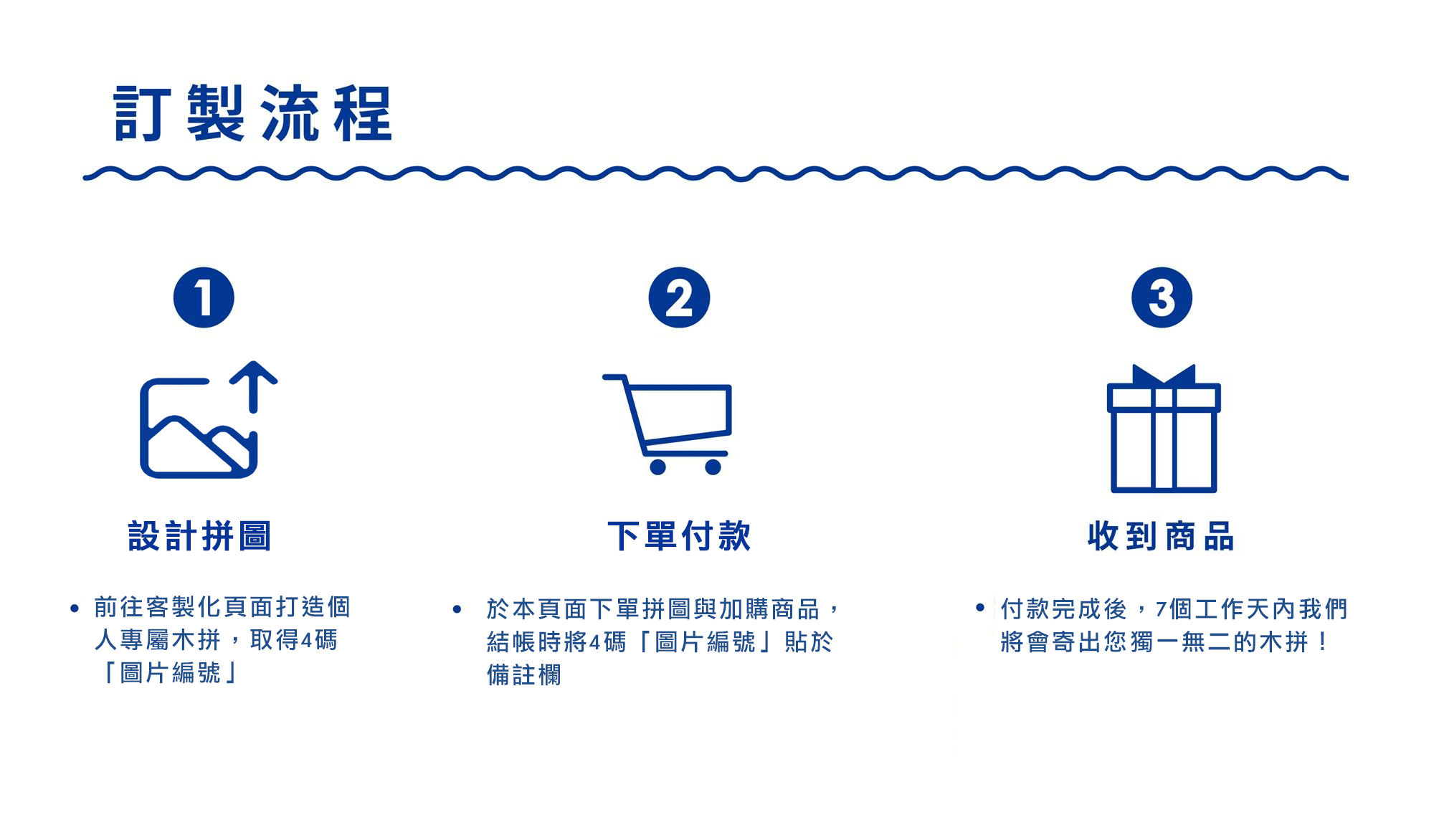 5.客製木拼屬於消費者專屬訂製商品,無七天鑑賞期及貨到付款服務。
