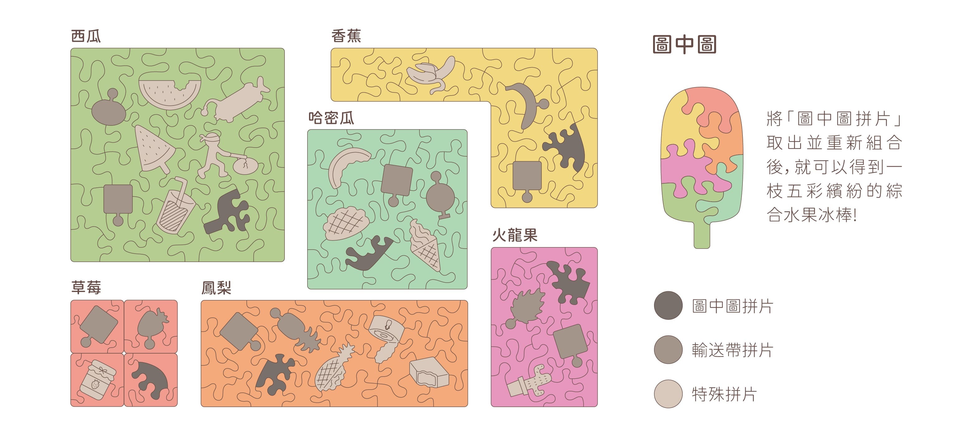 產品內容 : 木質拼圖150片+工廠拼圖4片、紙盒x1、說明書x1、黏黏筆x1