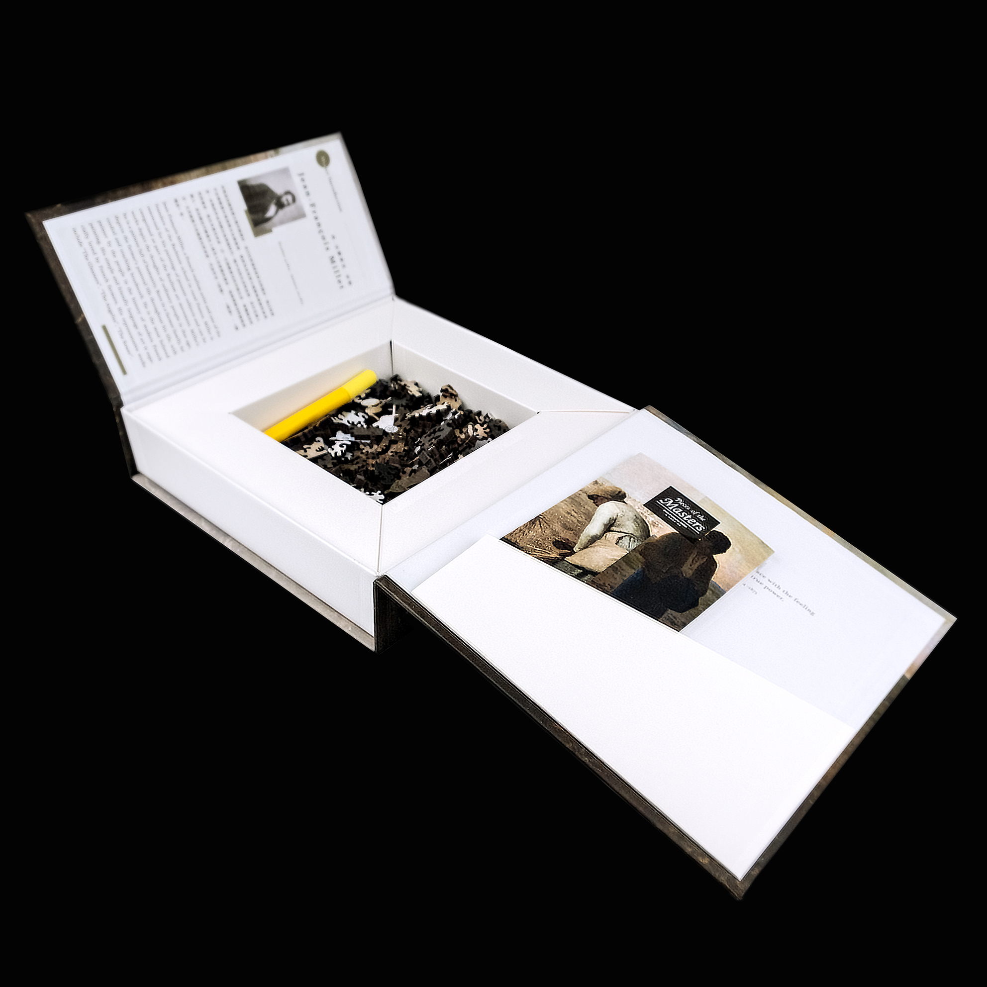 打開盒子,就像推開一扇通往博物館的門,映入眼簾的是大師的介紹、經典名言、拼圖本體、說明書與配件接著出現,還放了一個小秘密在盒子裡,等著你來尋找!