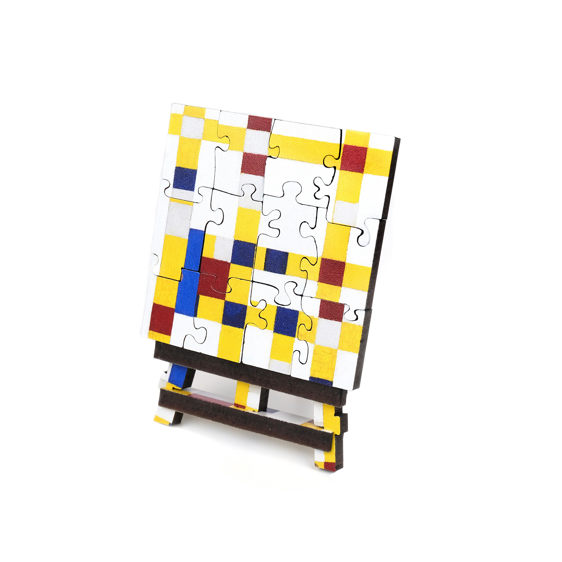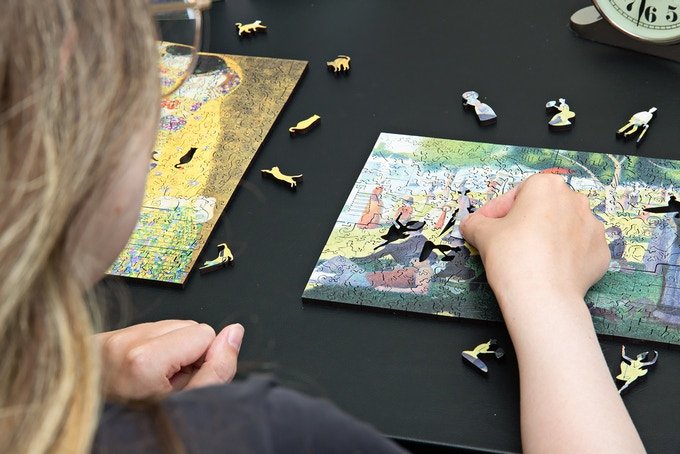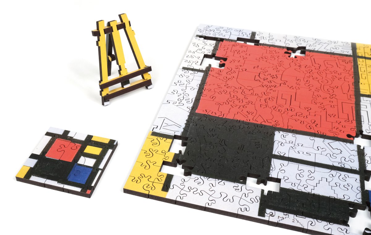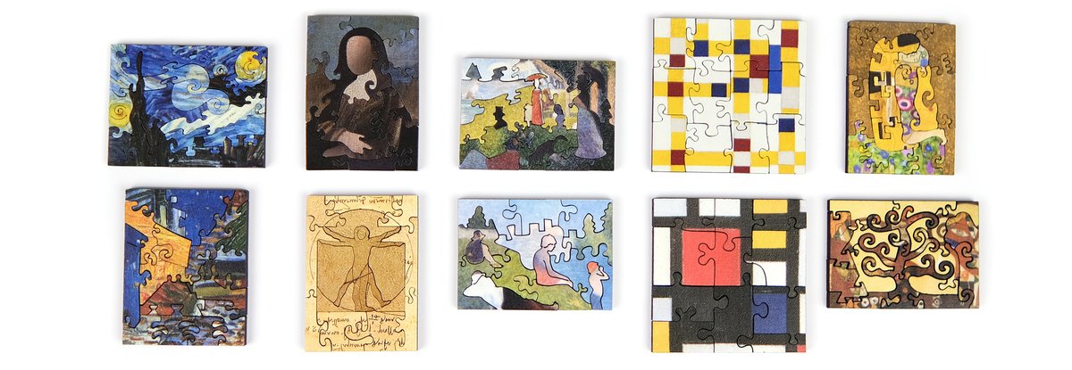 文藝復興時期什麼都會的達文西、點描派的佼佼者秀拉、喜歡裸女跟貓咪的克林姆、神經執著又憂鬱的梵谷、在設計界裡揮灑出獨特風格的蒙德里安、以端莊優雅的女性人物形象和唯美的線條聞名的慕夏、以寫實手法描繪的鄉村風俗畫聞名的米勒,七位大師的特色與知名作品都在這盒拼圖裡,一邊玩拼圖一邊看著說明書,帶你深入遨遊在藝術世界。
