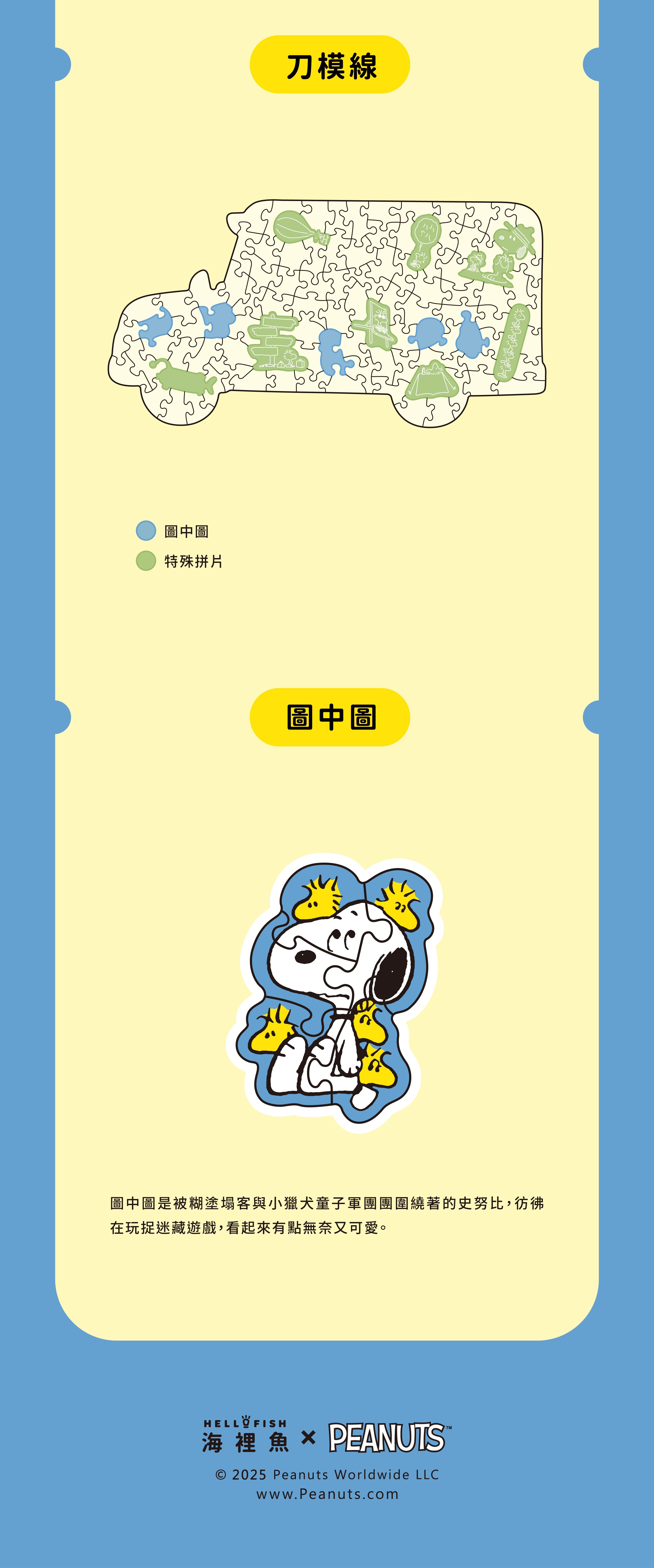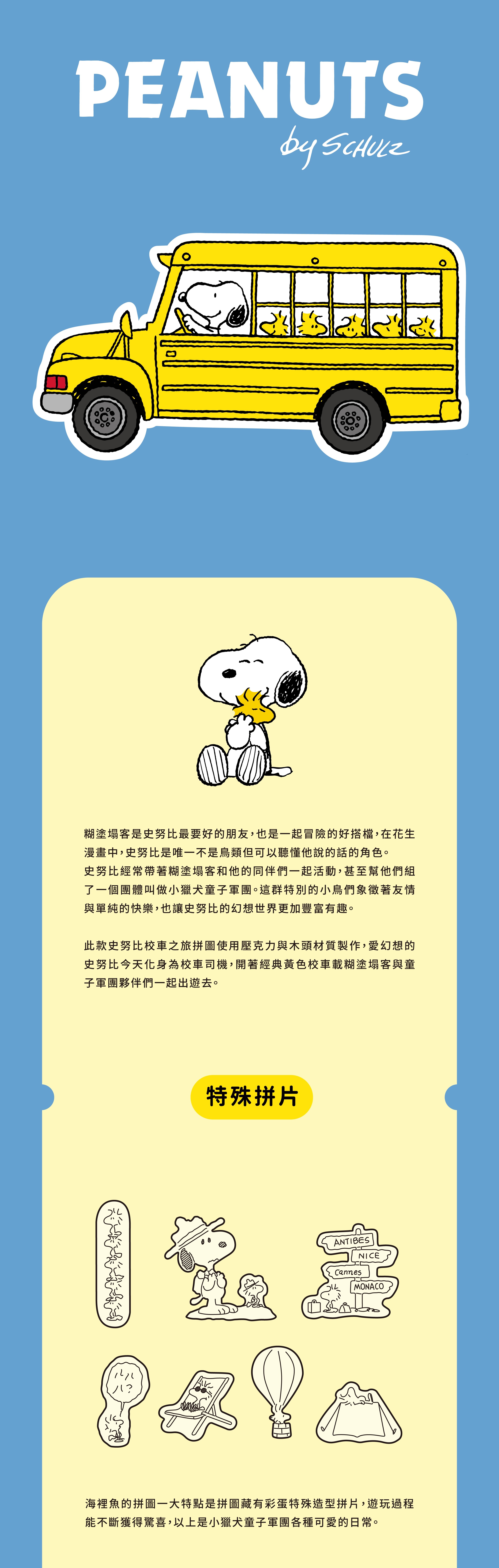 這款拼圖以校車為主題,車上載著 Snoopy 的好朋友們,每一位都是童子軍的小夥伴。最特別的是「圖中圖」設計,遊戲過程會慢慢浮現意想不到的小畫面、小角色,像拆禮物一樣,每一塊都藏著驚喜。適合親子共玩、也適合 Snoopy 粉絲自己慢慢拼慢慢享受!