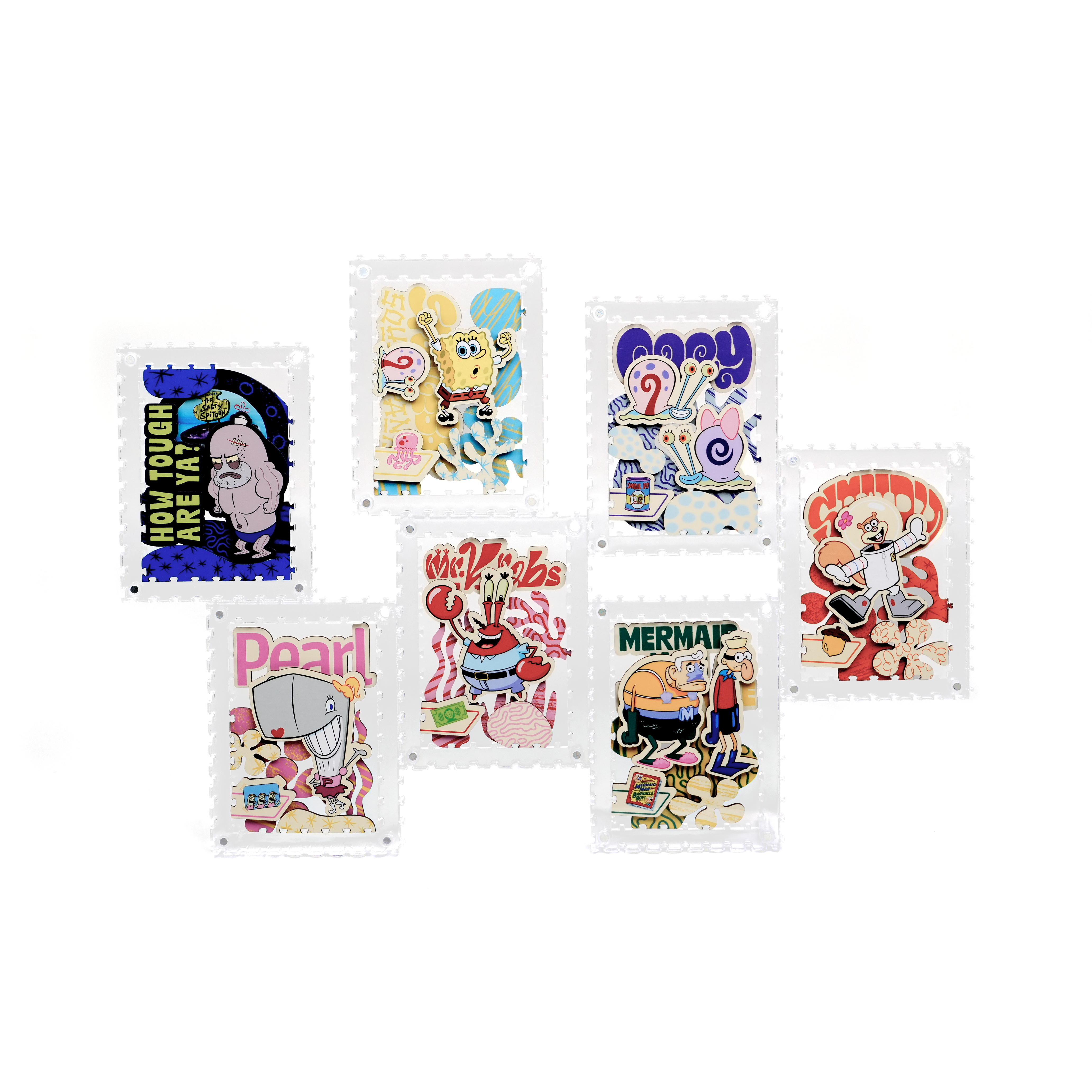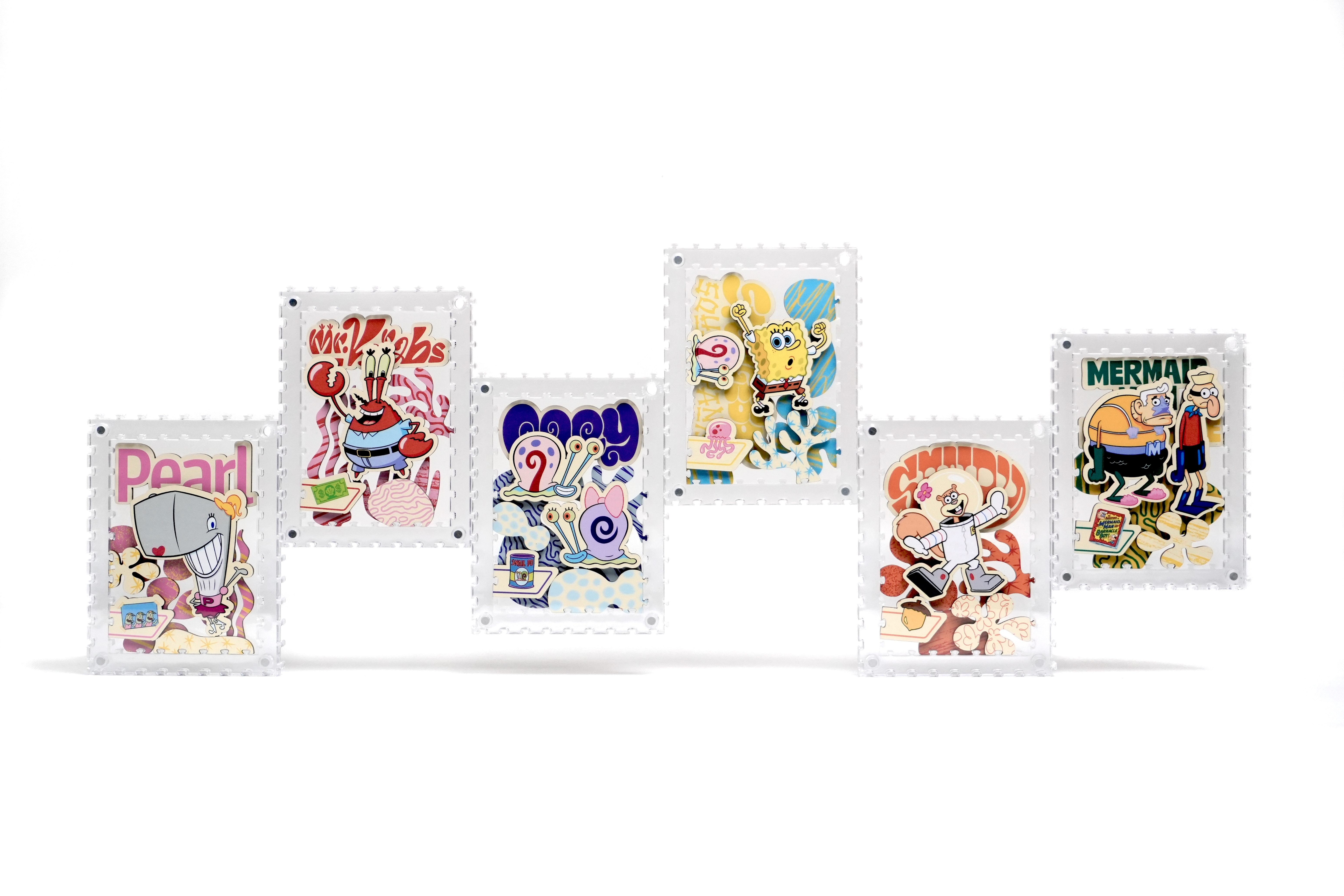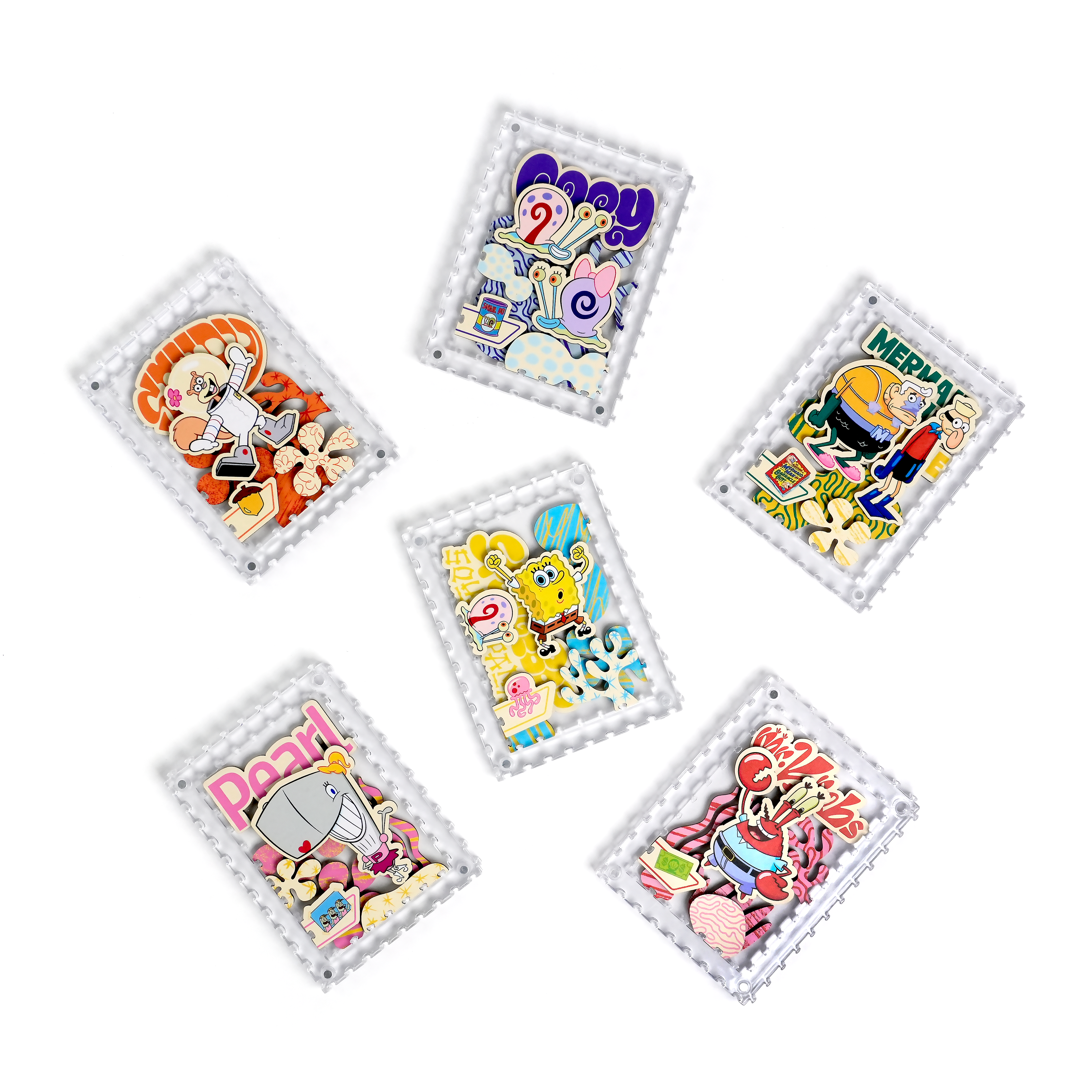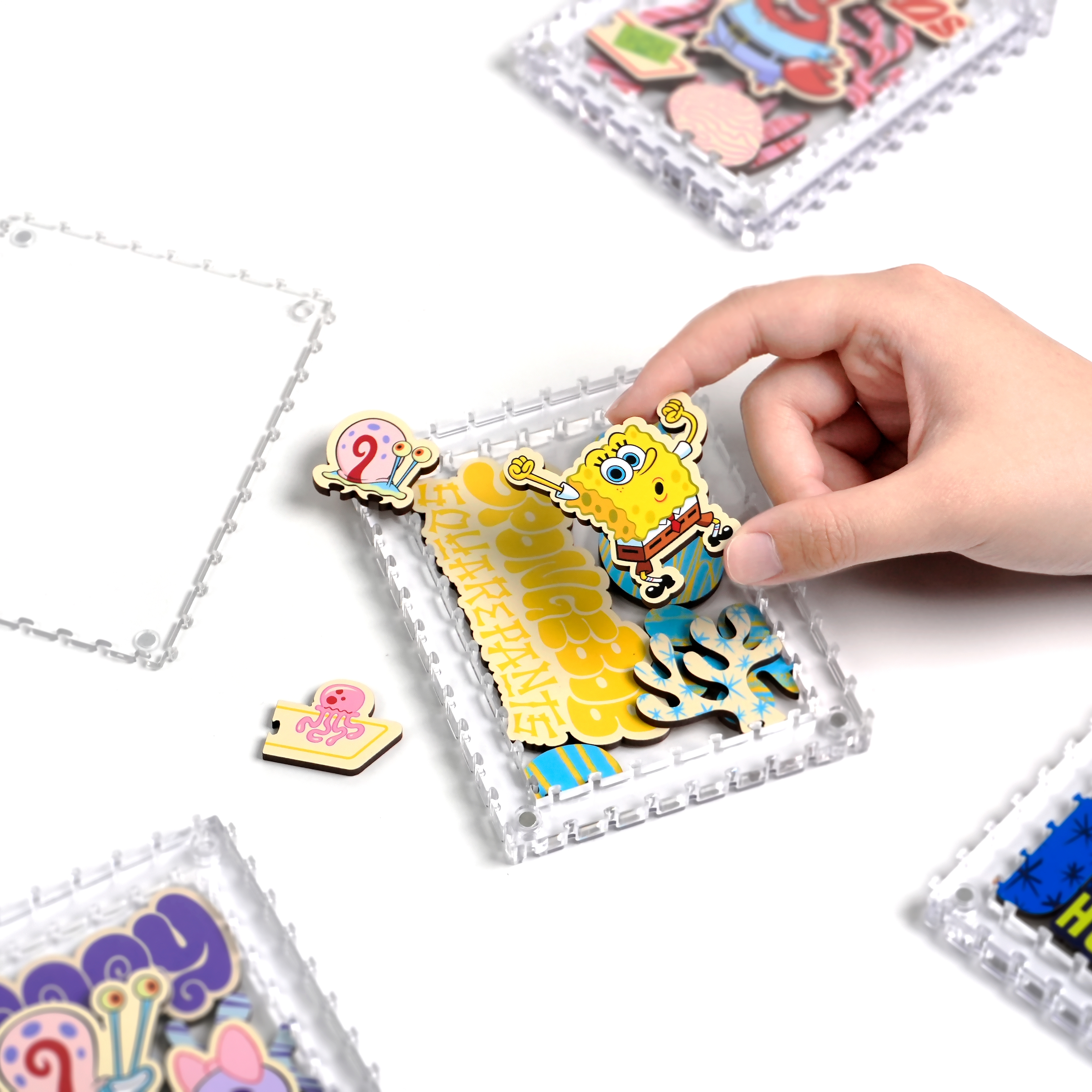 海綿寶寶、小蝸、珊迪與蟹老闆還有其他居民,一起化身成生動造型拼片,收納於磁吸壓克力相框中,層層堆疊呈現立體效果,手感與質感兼具。