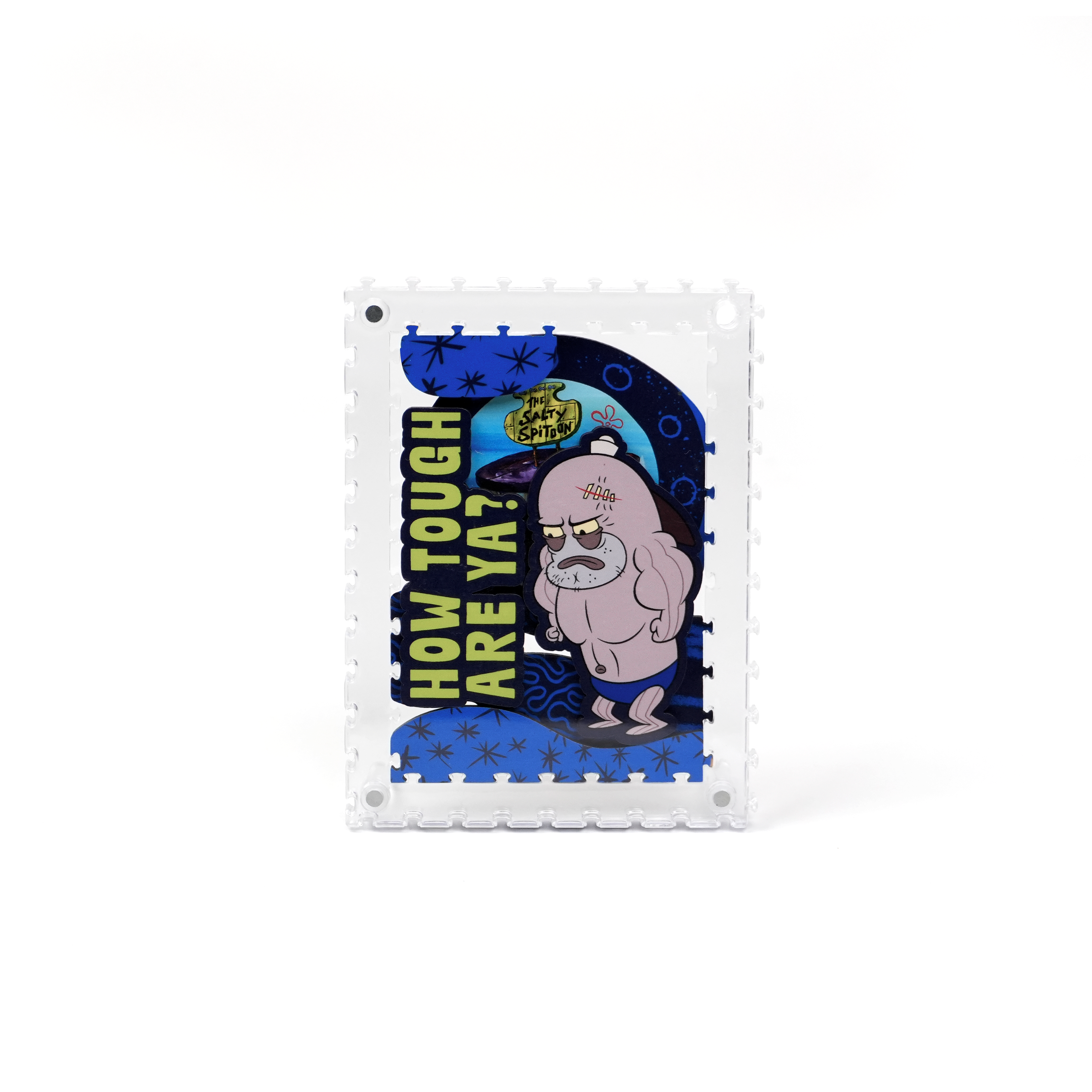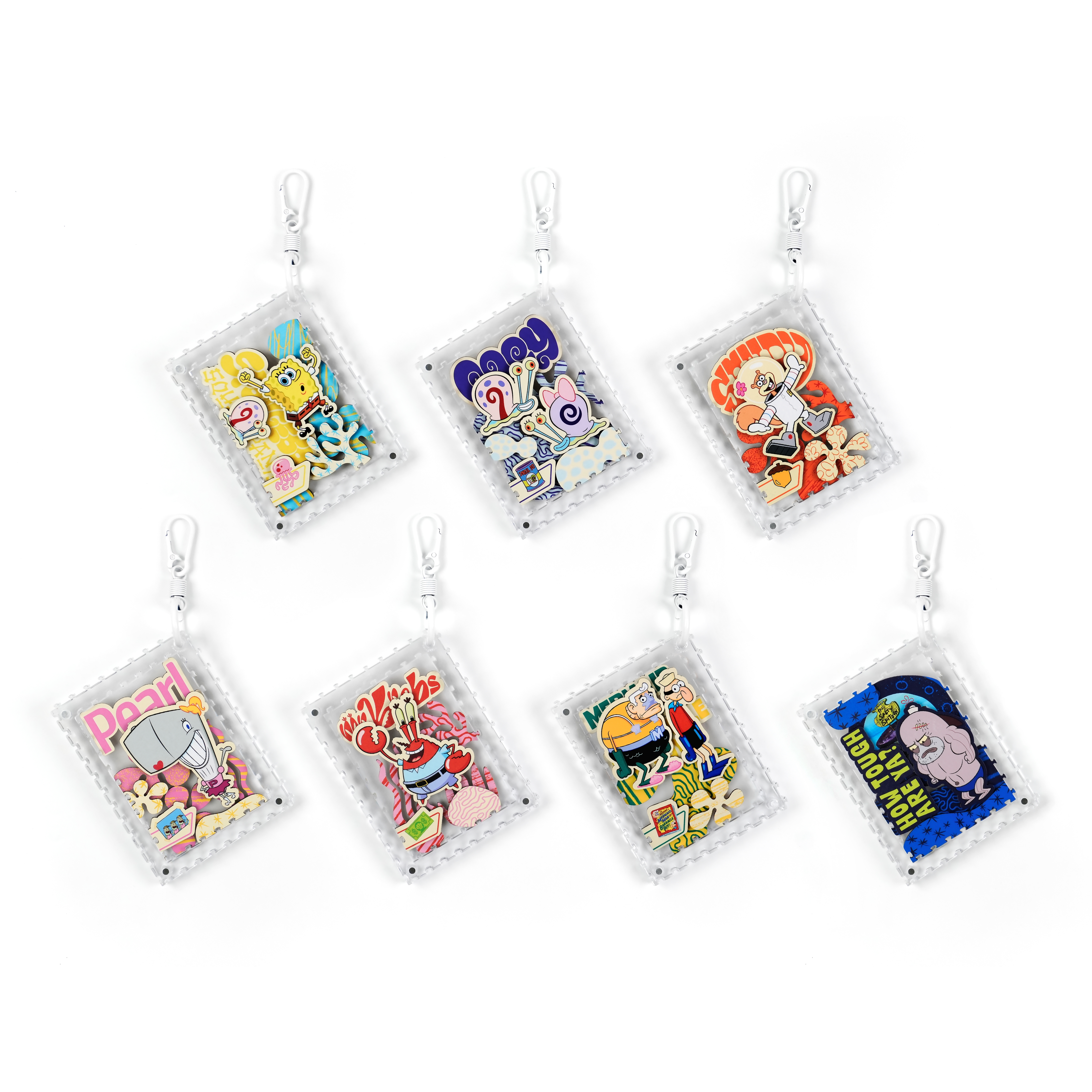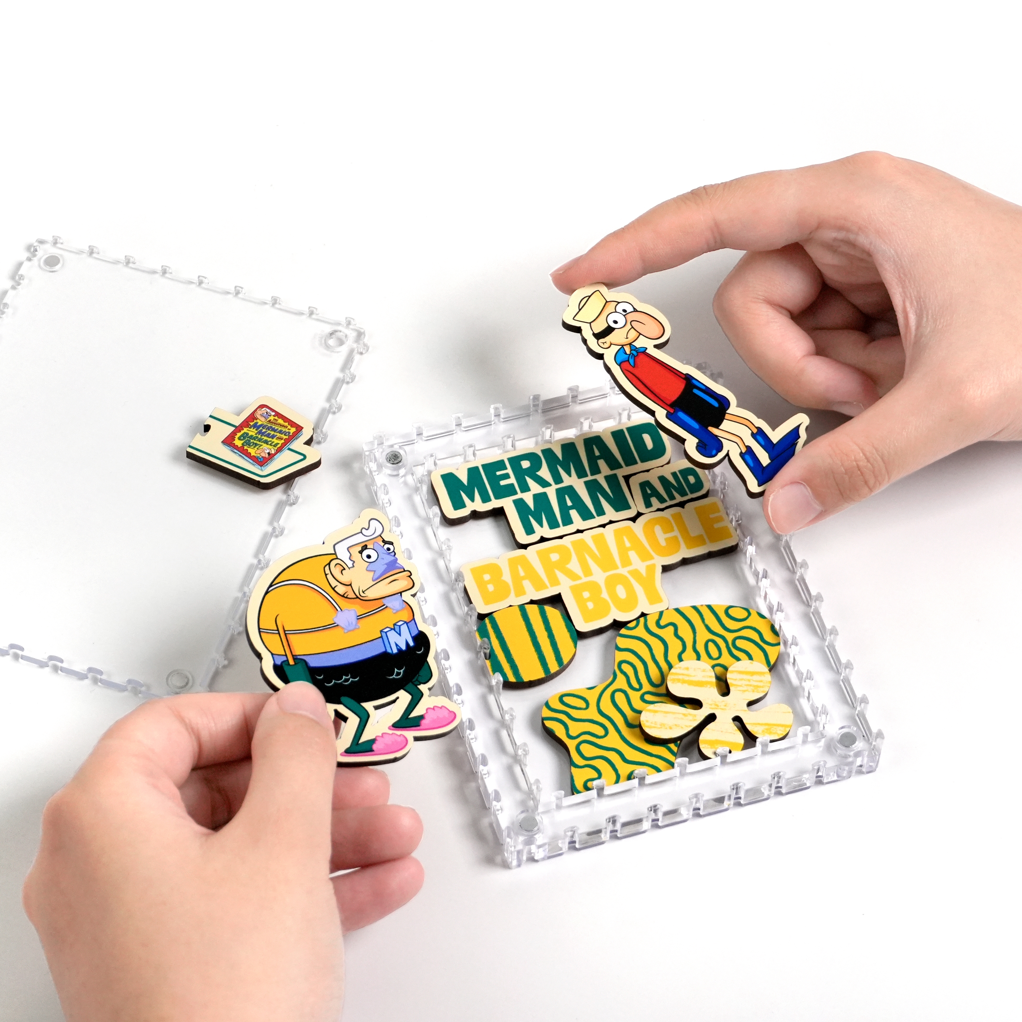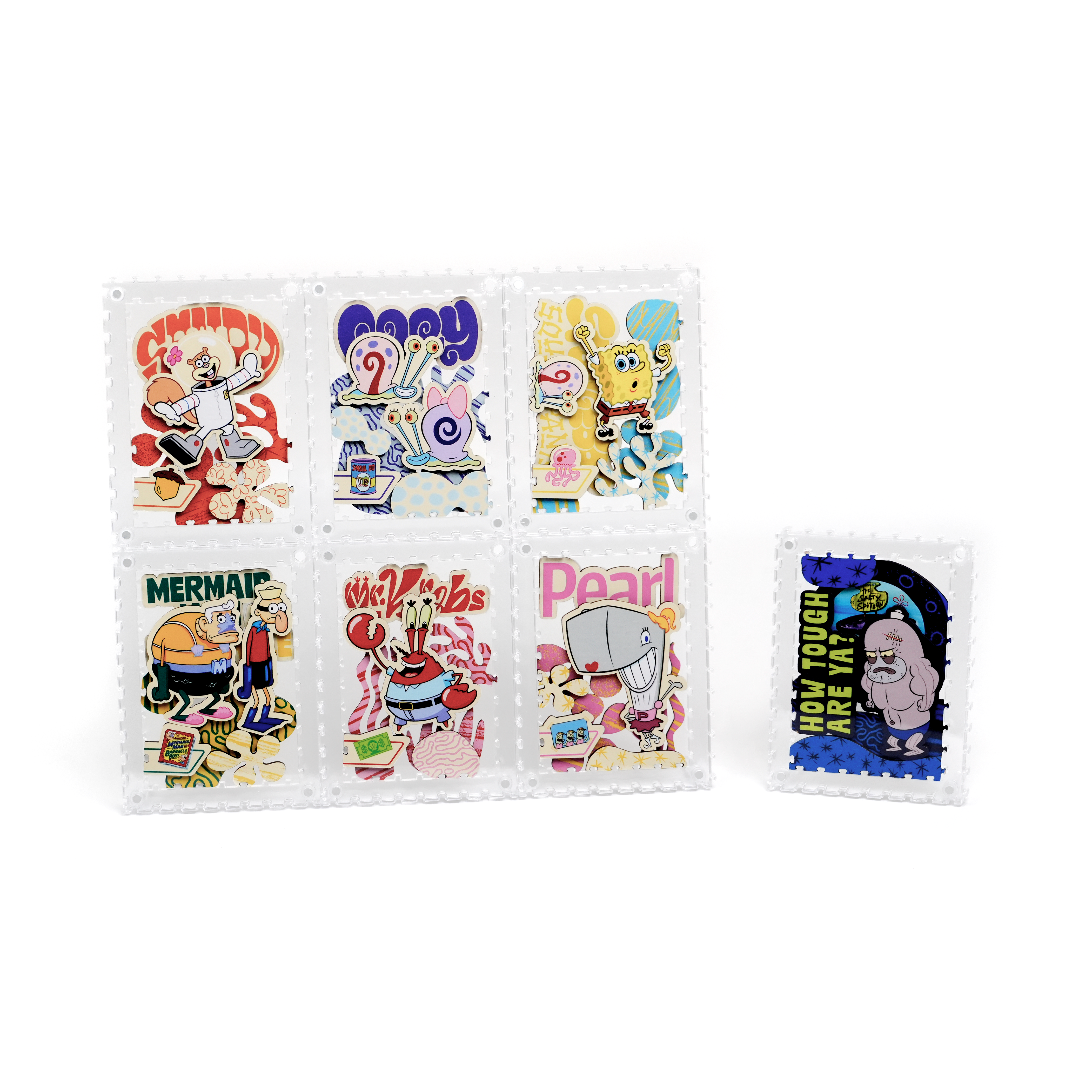 海綿寶寶、小蝸、珊迪與蟹老闆還有其他居民,一起化身成生動造型拼片,收納於磁吸壓克力相框中,層層堆疊呈現立體效果,手感與質感兼具。