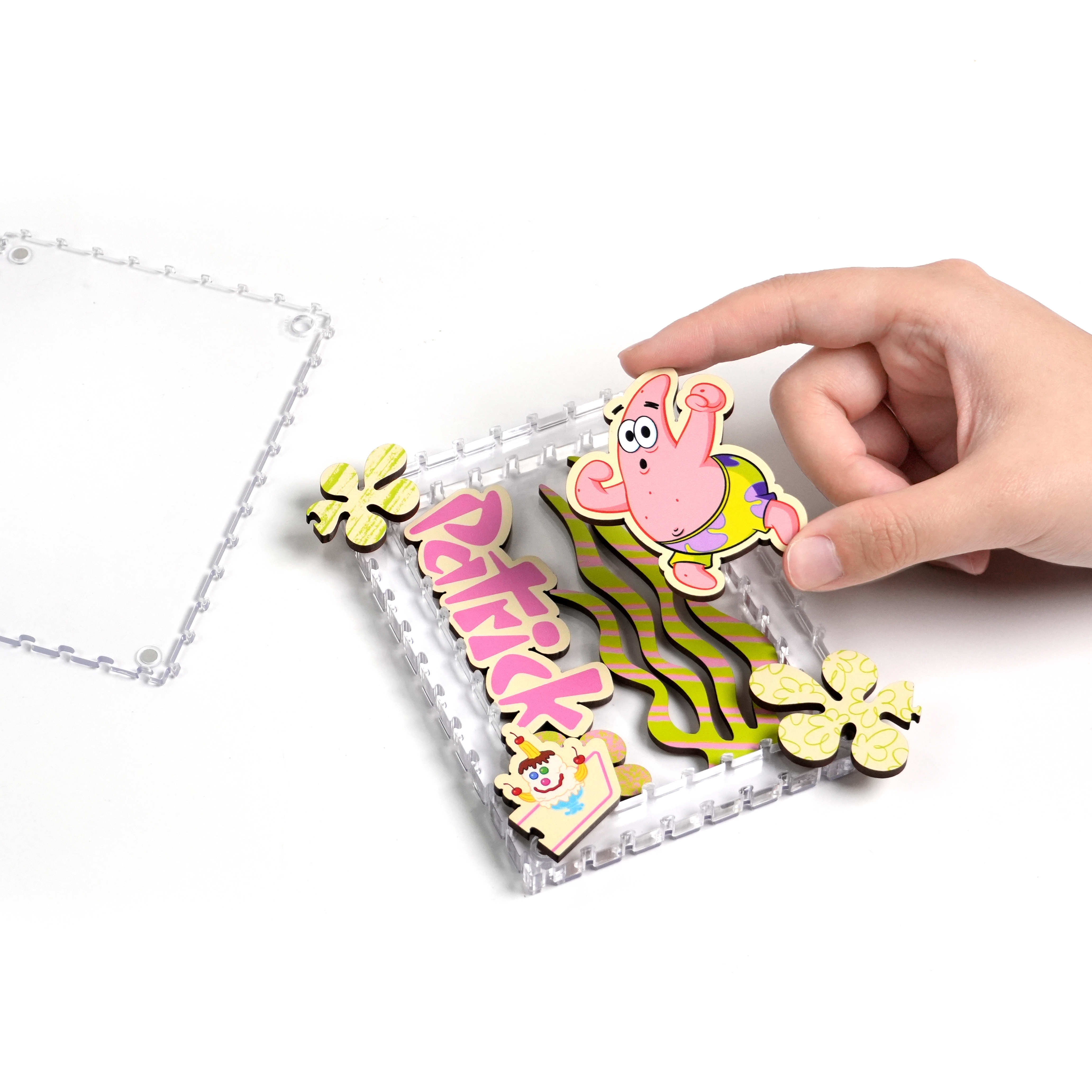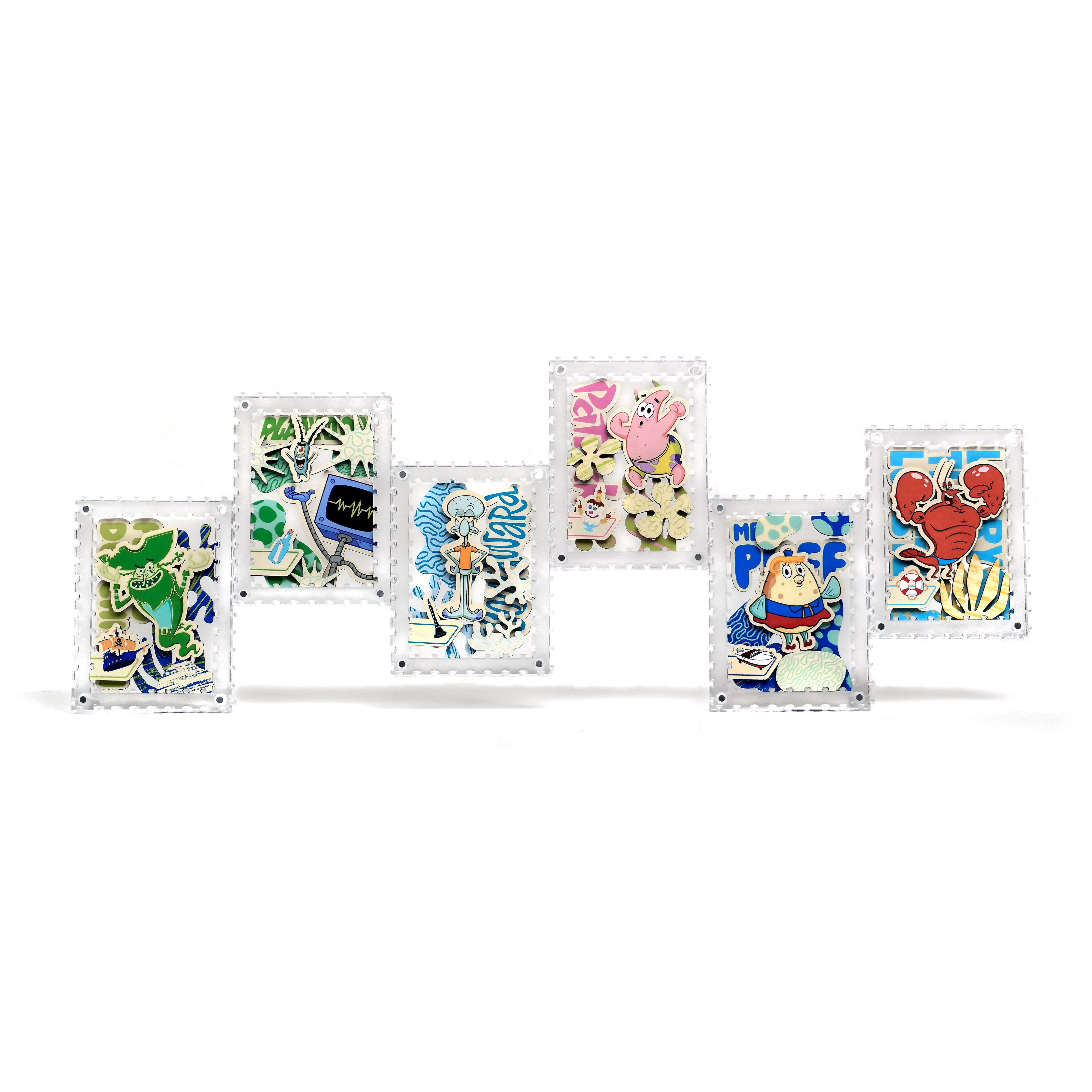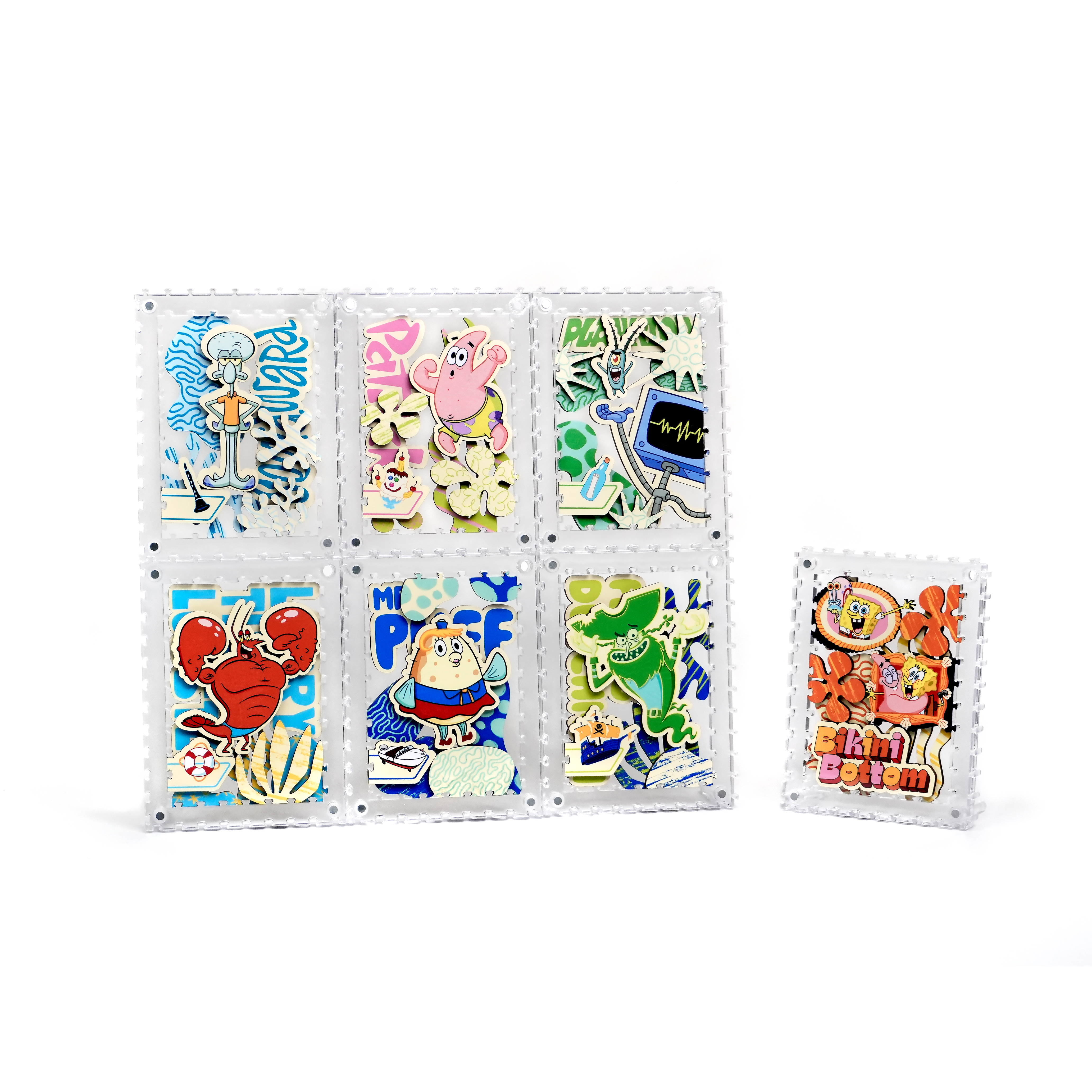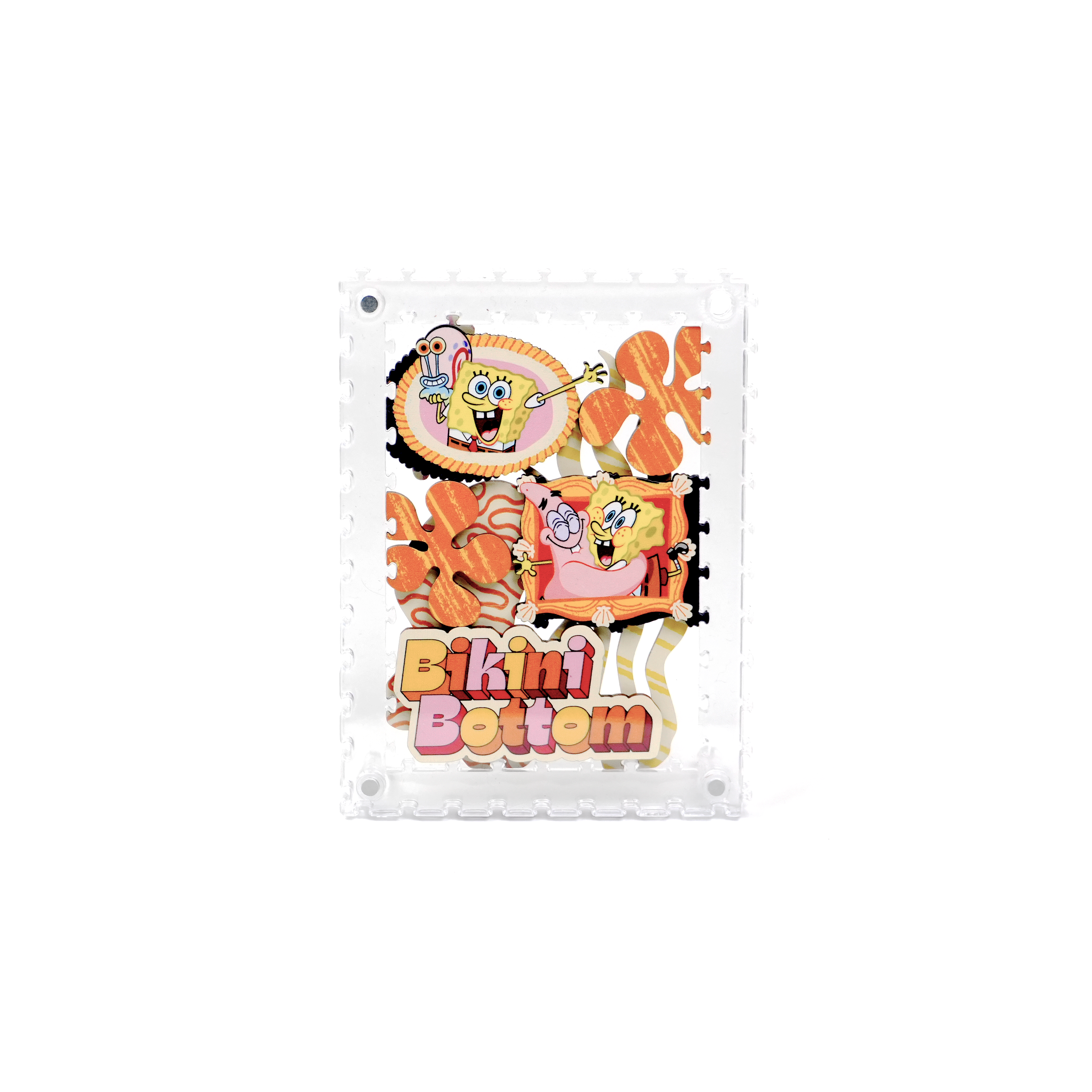 派大星、章魚哥與皮老闆還有其他居民,一起化身成生動造型拼片,收納於磁吸壓克力相框中,層層堆疊呈現立體效果,手感與質感兼具。