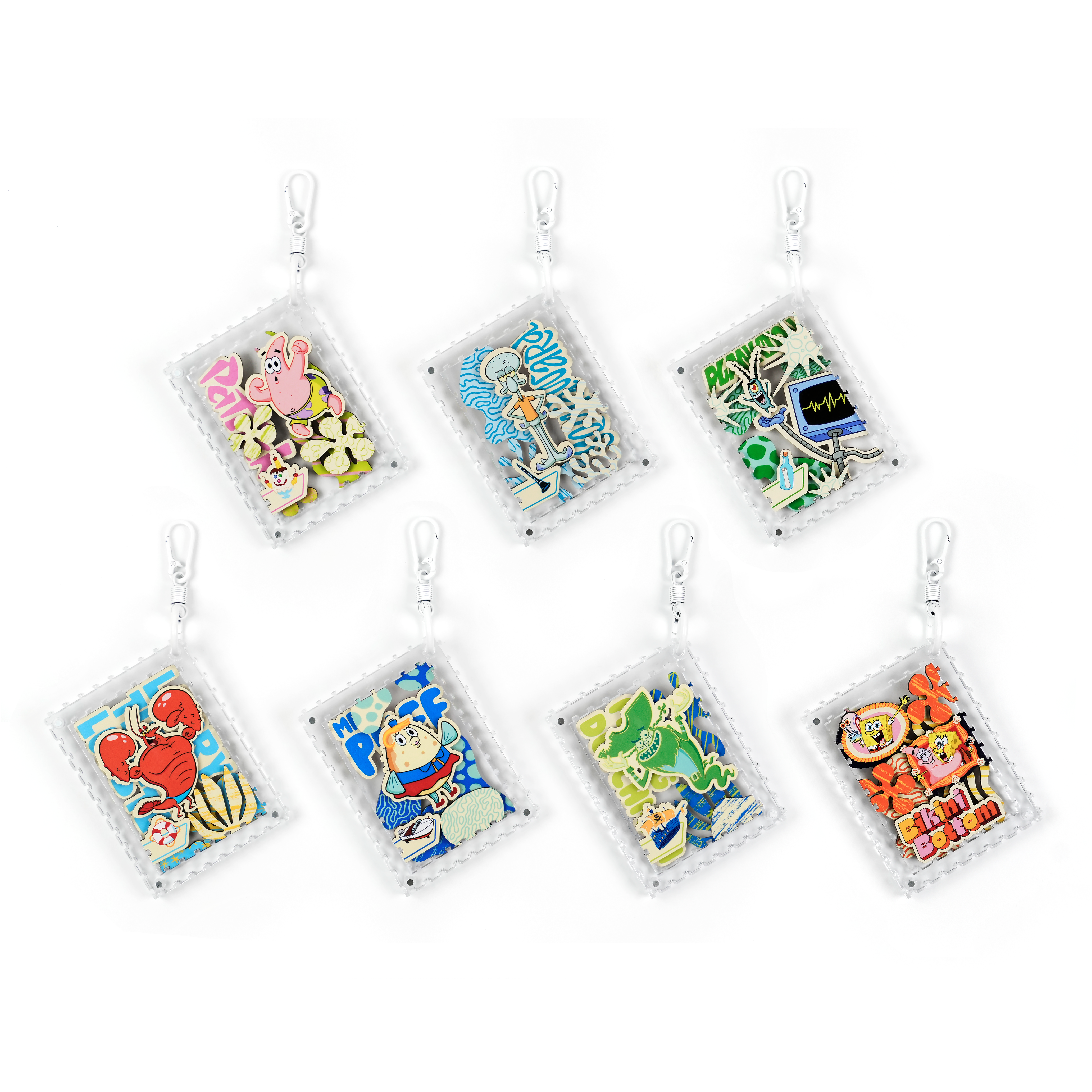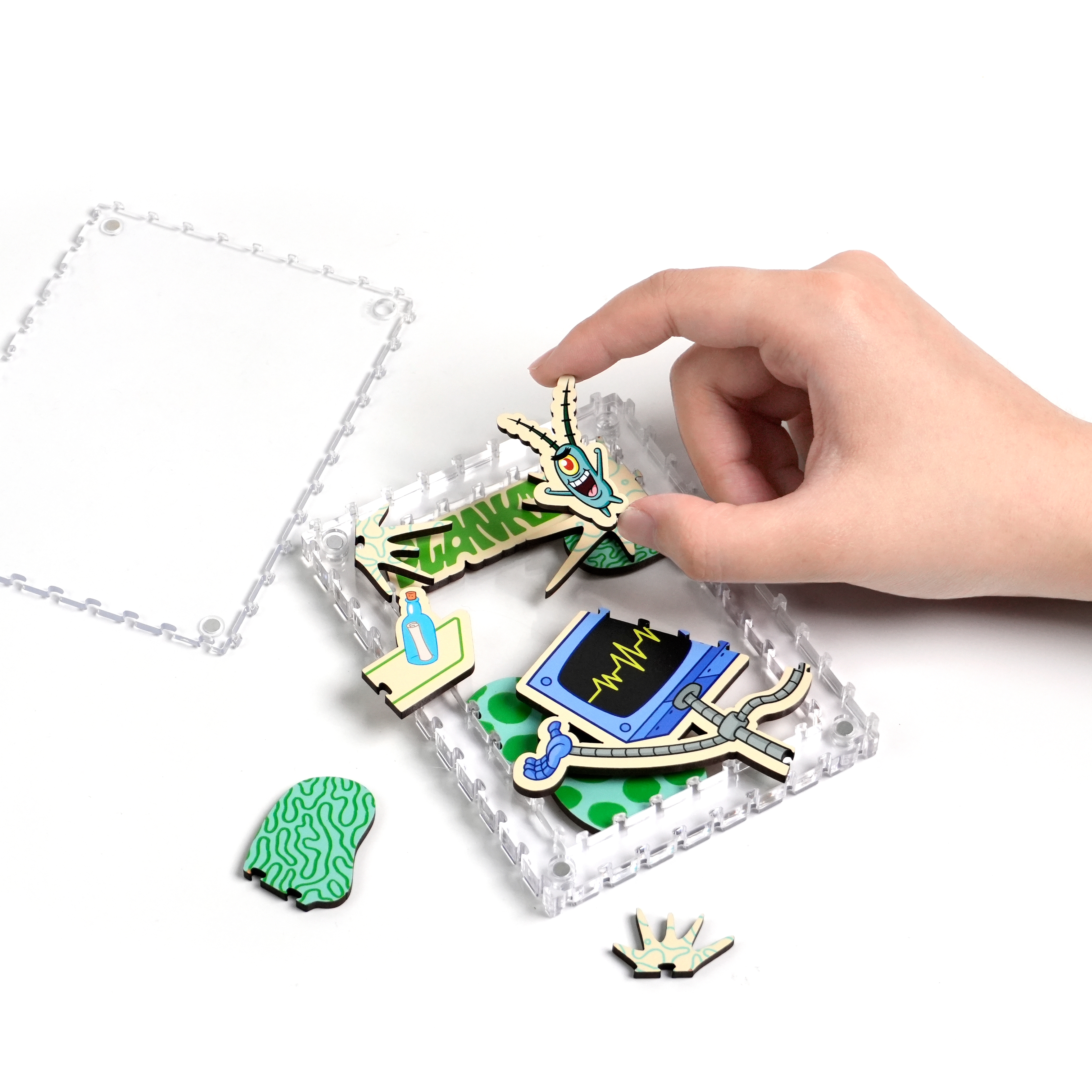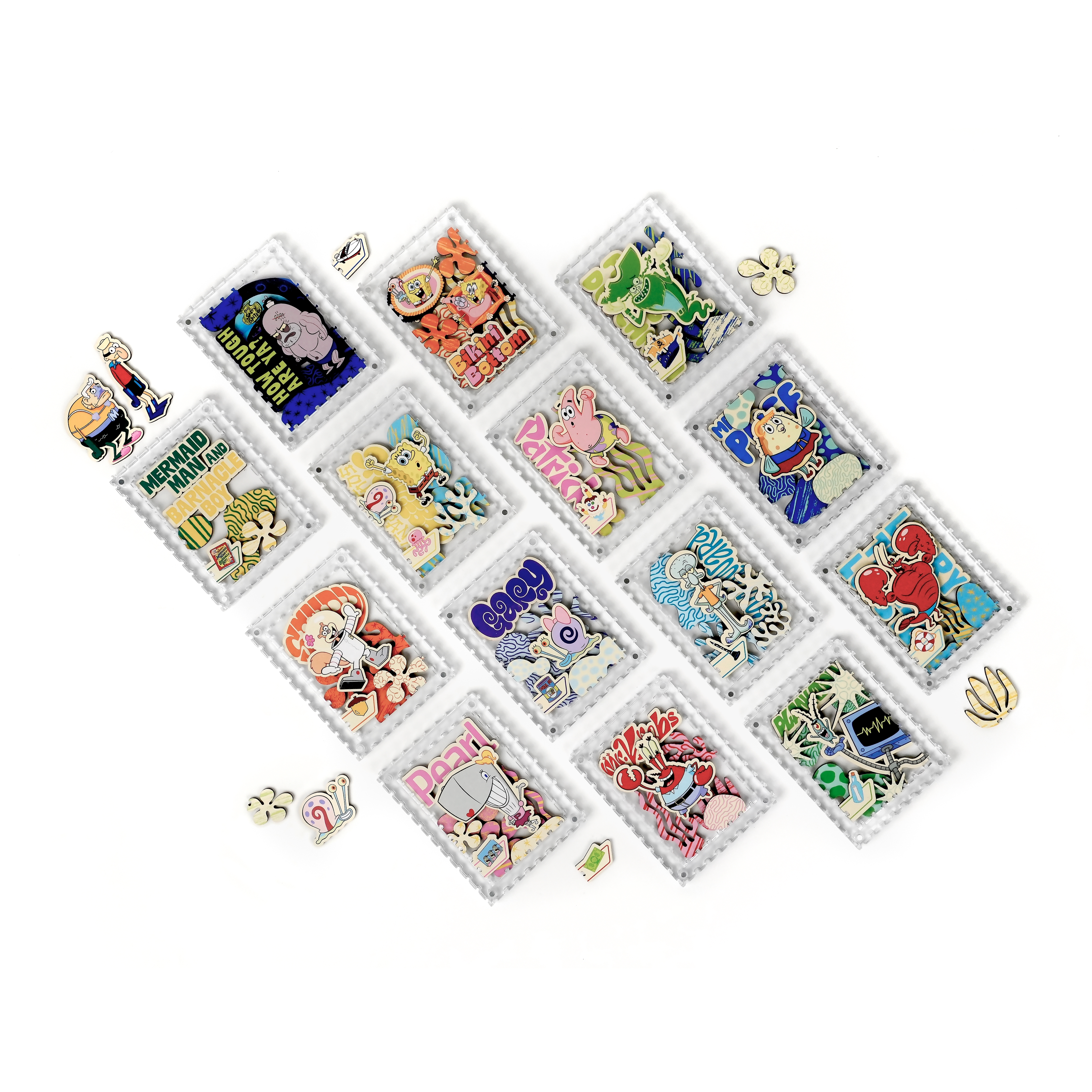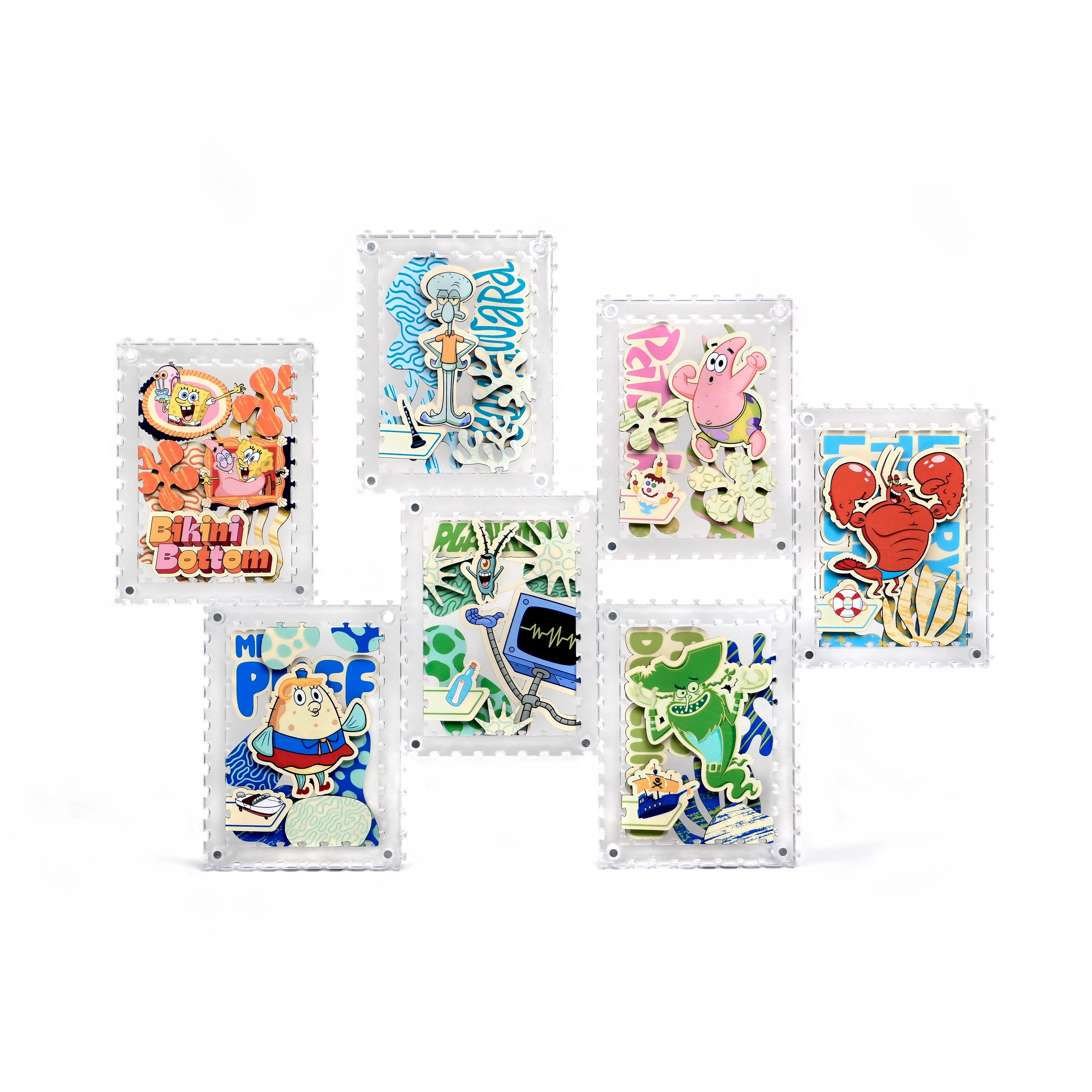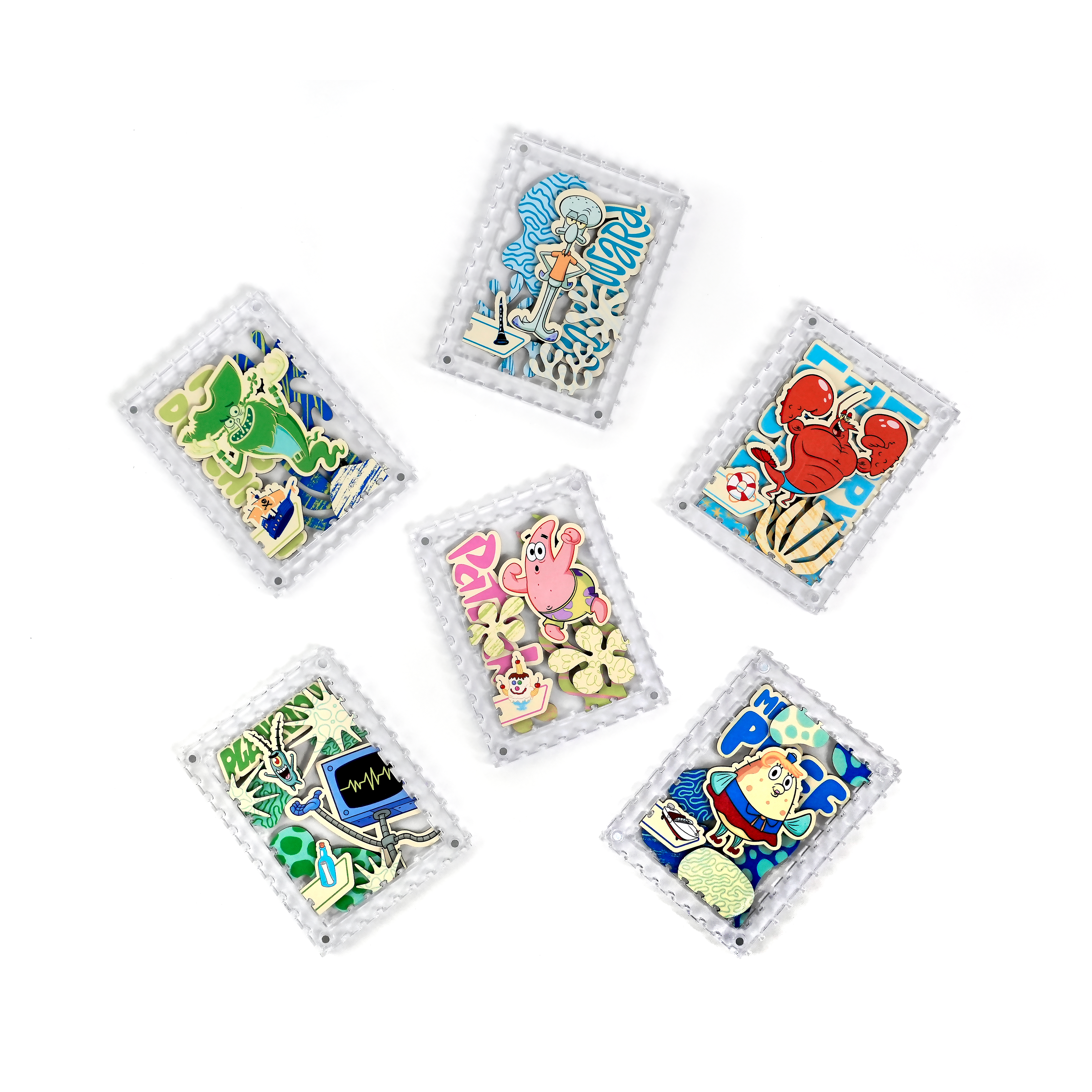 派大星、章魚哥與皮老闆還有其他居民,一起化身成生動造型拼片,收納於磁吸壓克力相框中,層層堆疊呈現立體效果,手感與質感兼具。