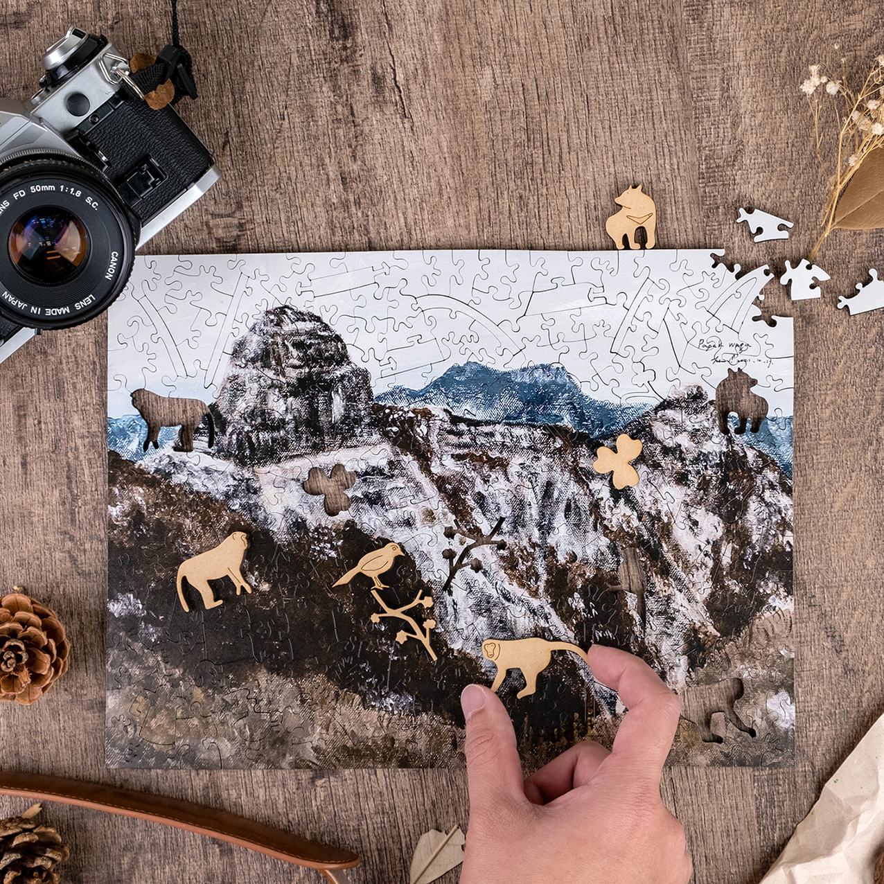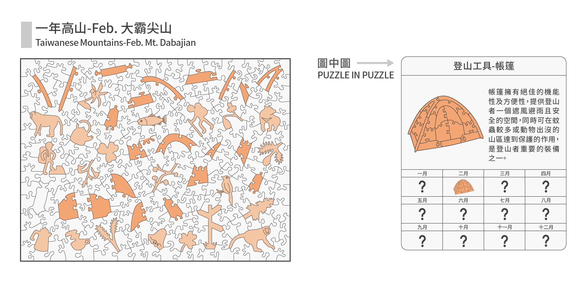 產品內容:木質拼圖250片、說明書x1、補缺片卡x1、小卡x1、天地紙盒x1