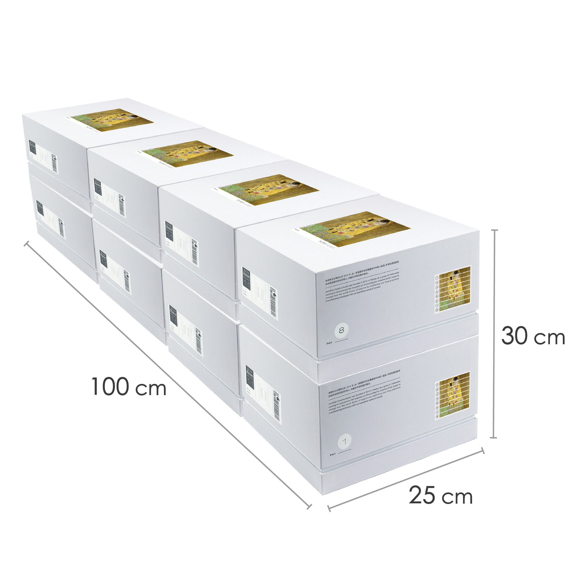 產品內容:木質拼圖1200片、說明書 x 1、保證卡 x 1、補缺片卡、黏黏筆 x 1、三套式直角禮盒 x 8