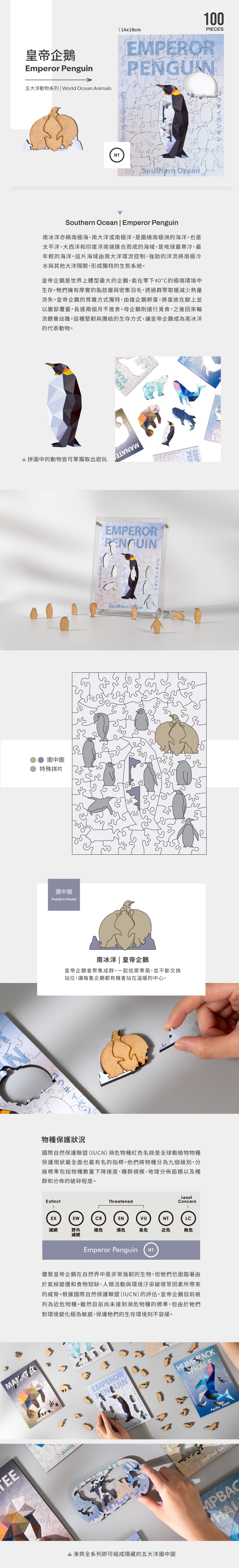 皇帝企鵝是最能適應寒冷環境的企鵝品種,牠們在極寒之地繁衍後代,並互相依偎以抵禦酷寒。拼湊這款拼圖,感受牠們頑強生命力與溫馨的親情。