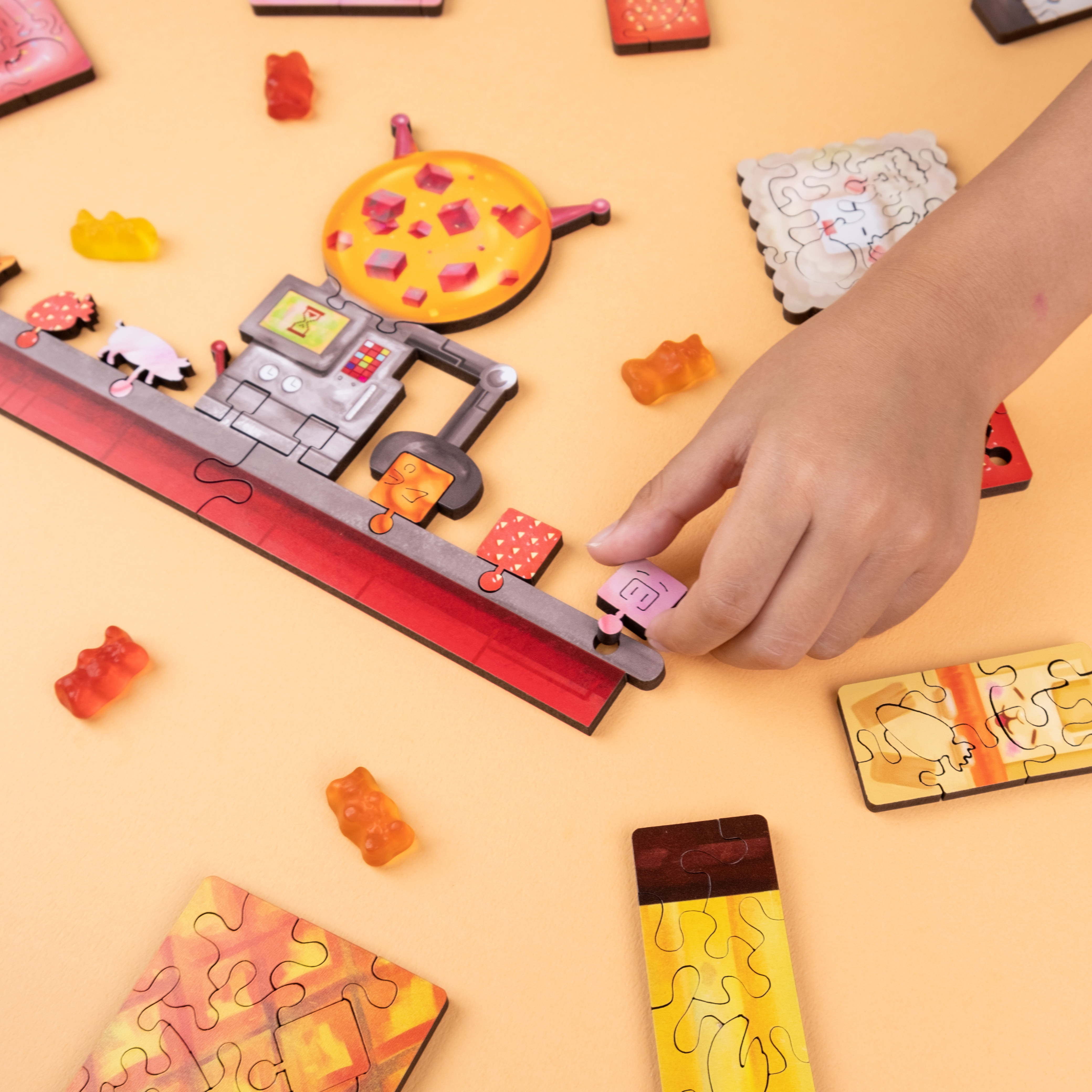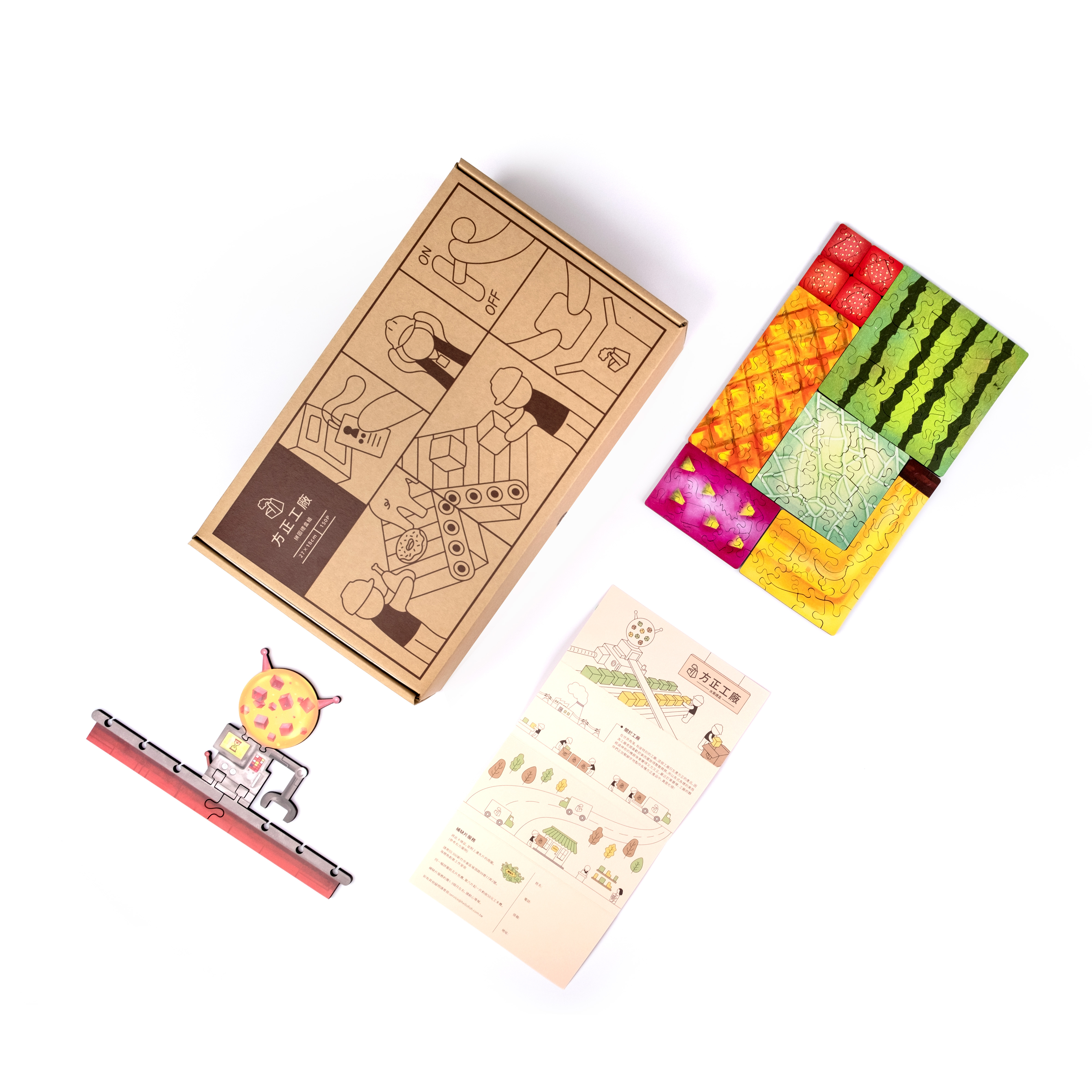 產品內容 : 木質拼圖150片+工廠拼圖4片、紙盒x1、說明書x1、黏黏筆x1