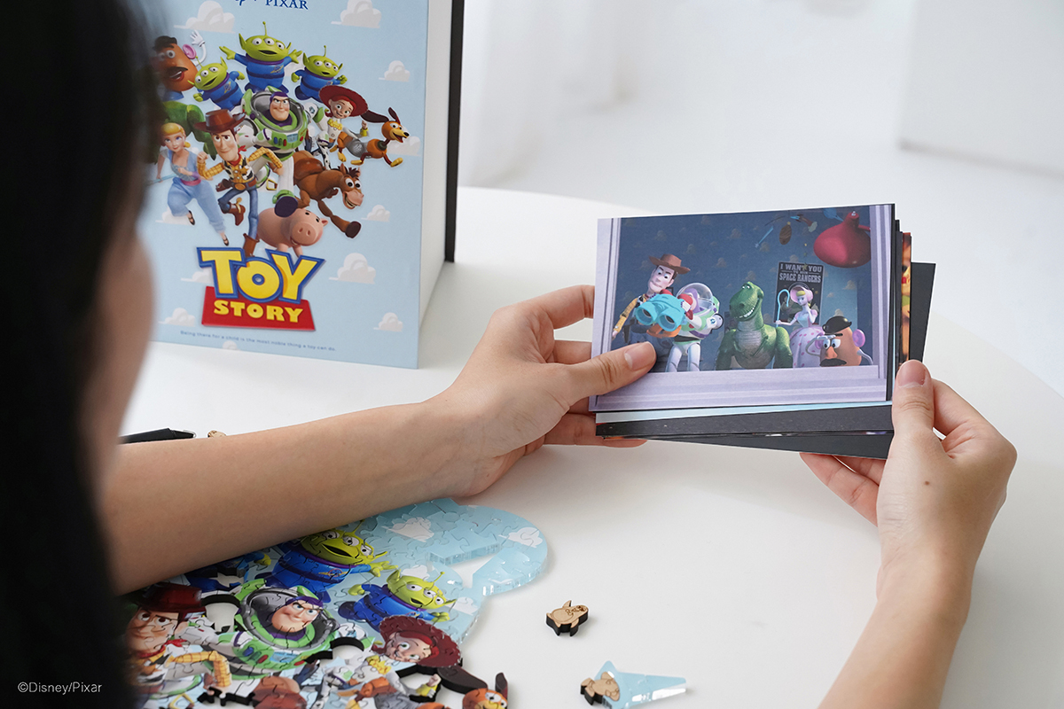 皮可斯的故事拿在手上就像是一本本厚重的小說!作為電影內容延伸的載體,我們的拼圖在包裝上採用了精裝書型磁扣盒,依照三種片數分為不同厚度的書盒,一字排開收藏起來!彷彿自己就是皮克斯系的博士。我們總是希望拼圖可以不只有一種玩法,因此在盒蓋內側黏有一塊高密度泡棉軋型的電影背景,在完成拼圖後,可以將圖中圖放入專屬的泡棉中,即可完美還原圖中圖的經典電影場景。